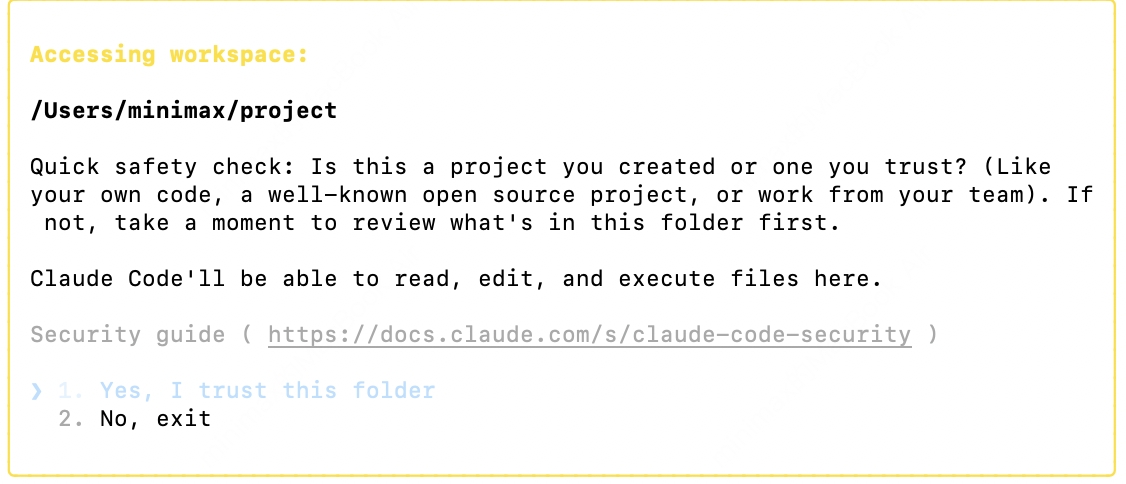 启动后,选择 信任此文件夹 (Trust This Folder),以允许 Claude Code 访问该文件夹中的文件,随后开始在 Claude Code 中使用配置好的模型。