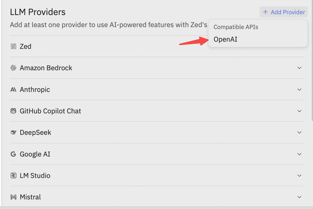找到 LLM Provider 模块,点击 +Add Provider 并在出现的下拉框中选择 OpenAI 进行模型添加: